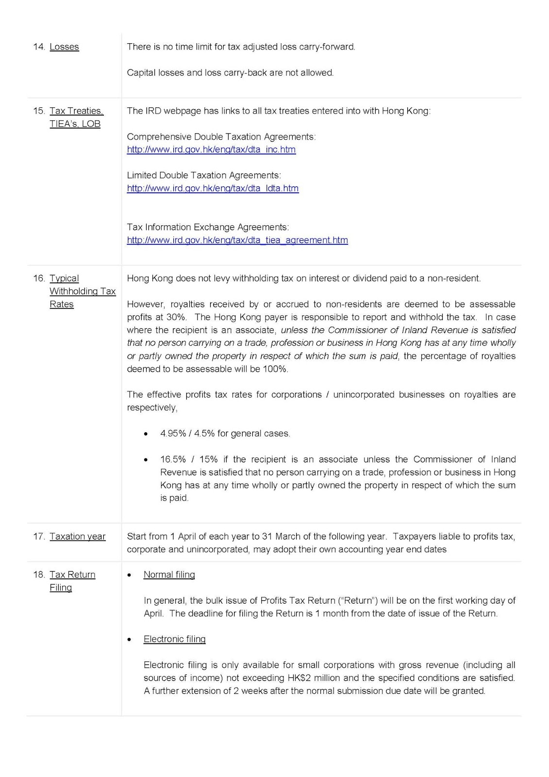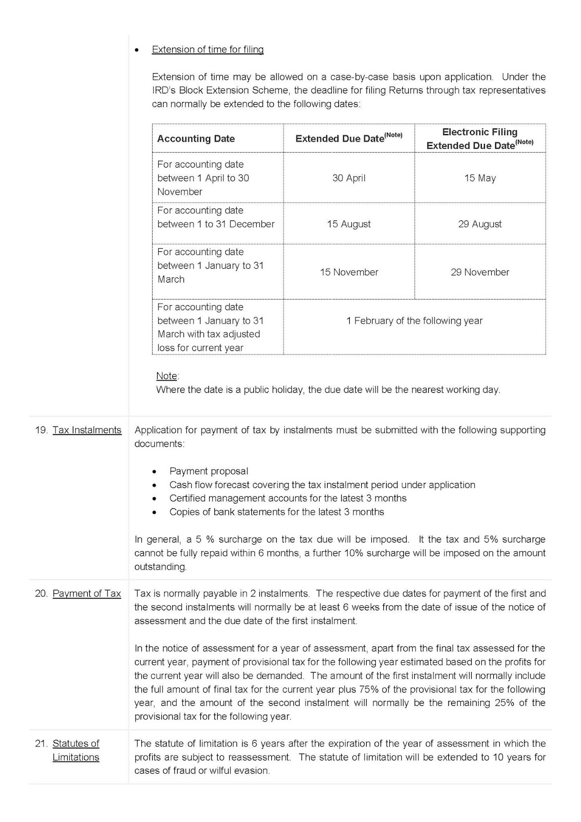 Tax is charged on the assessable profits for the year of assessment. The assessable profits for a business that makes up annual accounts are calculated on the profits of the year of account ending in the year of assessment. Generally, profits tax returns should be filed within one month of the date of issue. However, under the IRD’s Block Extension Scheme, this may be extended depending on the accounting date of the company. If a business objects to a tax assessment issued by the IRD, it has the right to file an objection within one month of the issuance of the assessment with the IRD, which will then render a determination that is subject to appeal to the IRD Board of Review as well as the Hong Kong courts.