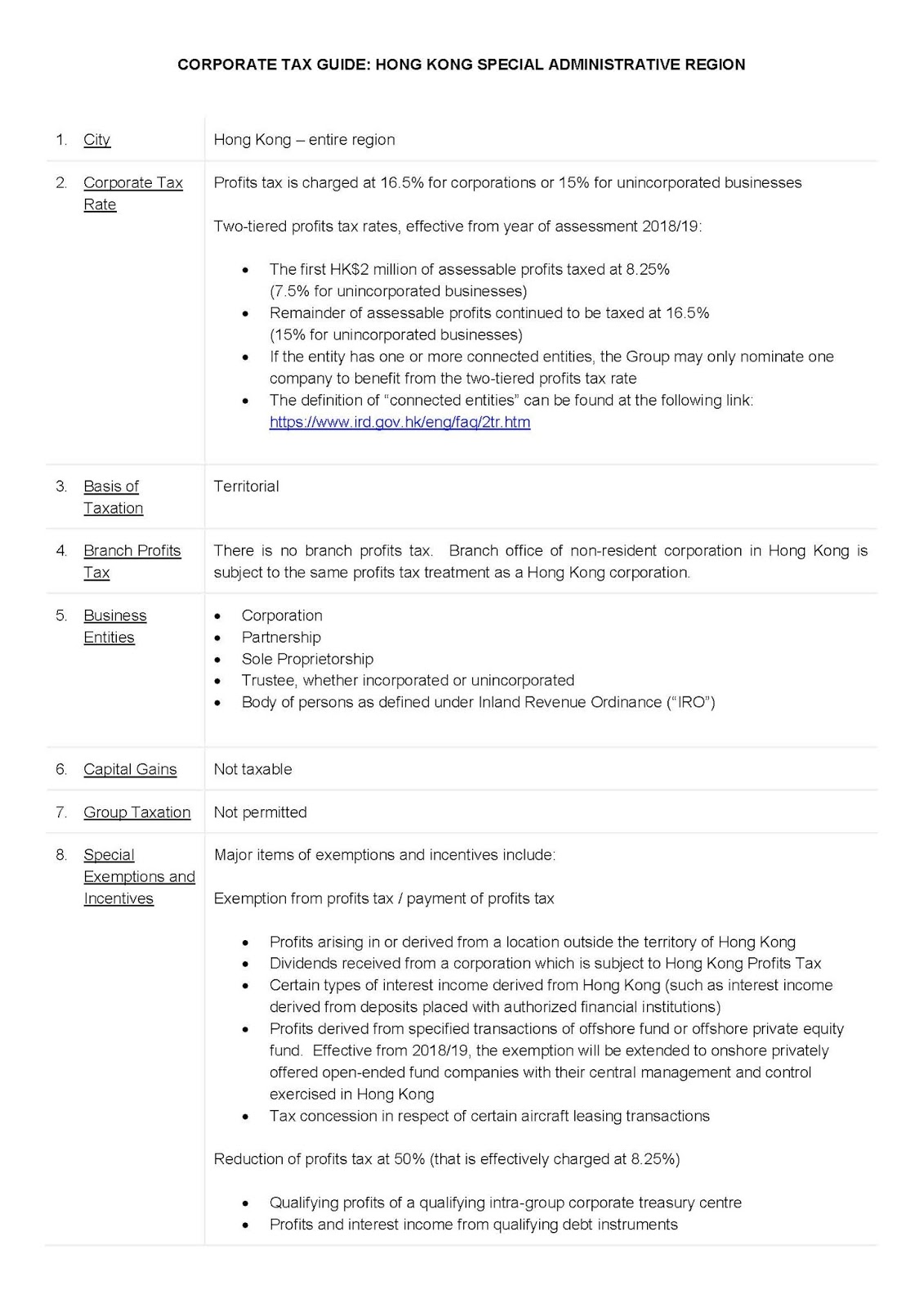 The profits tax rate for companies is 8.25 per cent for the first HK$2 million of profits and 16.5 per cent for profits in excess of HK$2 million, subject to restrictions on connected entities discussed in Section II.i. If a company is a partner in a partnership, profits tax for its share of assessable profits is also charged according to the same two-tiered system of 8.25 per cent and 16.5 per cent. The rate for unincorporated businesses is 7.5 per cent for the first HK$2 million of profits and 15 per cent for profits in excess of that amount, subject to restrictions on connected entities as well.